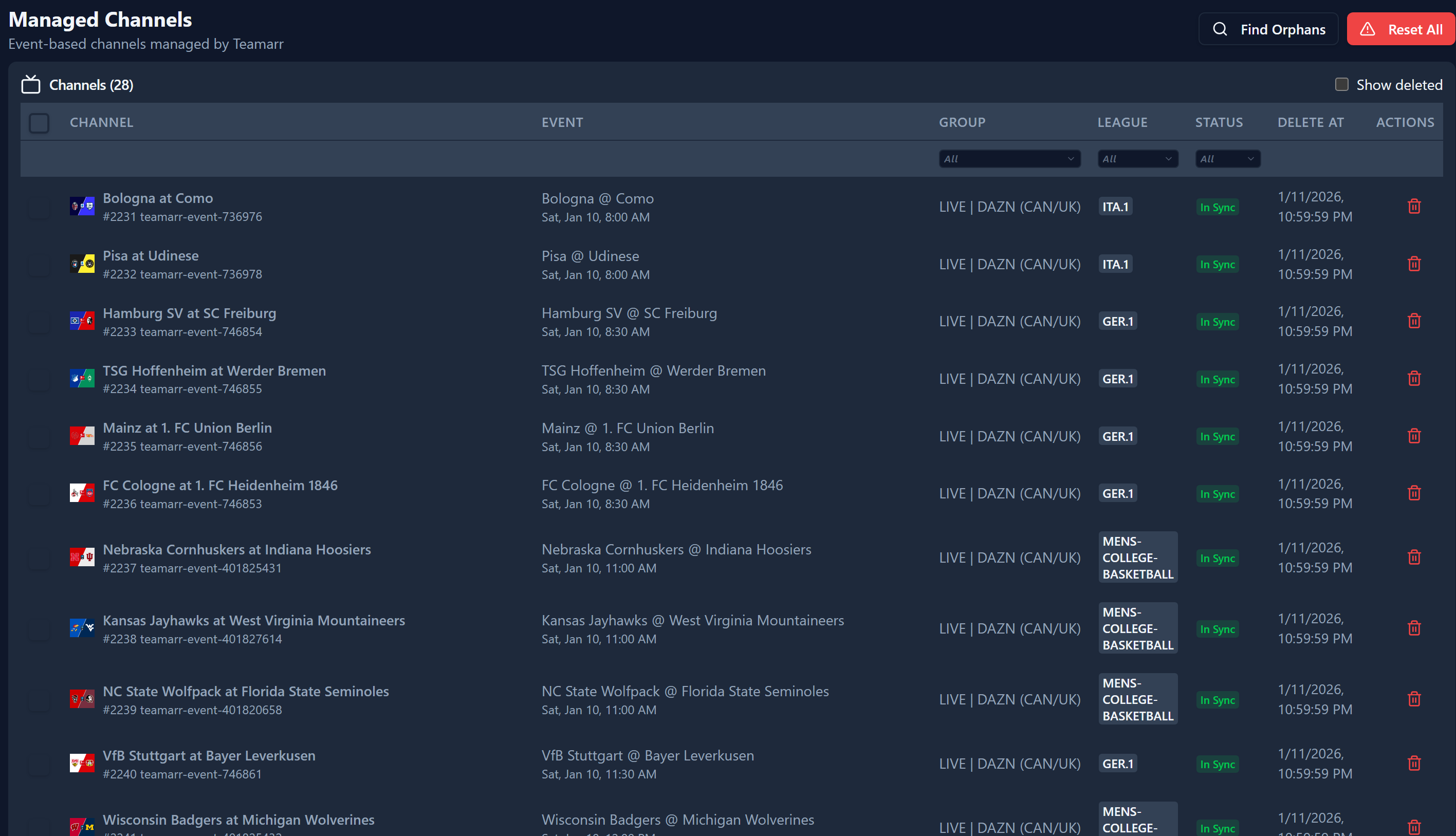 On the Channels page you will see the created channels and their details. You can use the Find Orphans if your Ddispatcharr has any leftover channels that should have been deleted and Reset All will delete all Teamarr created channels until the next EPG generation.