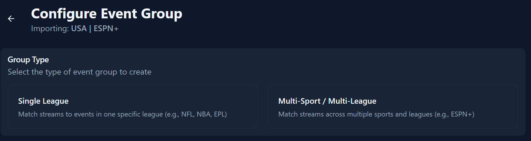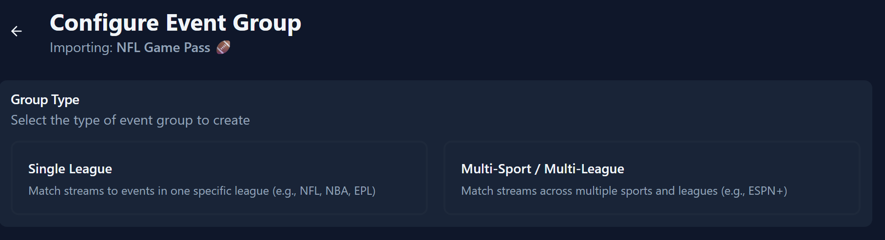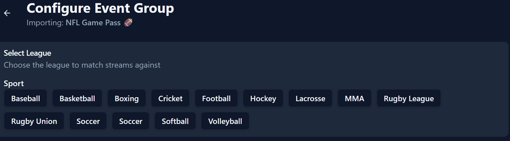 Single League - All streams in the group you wish to import are