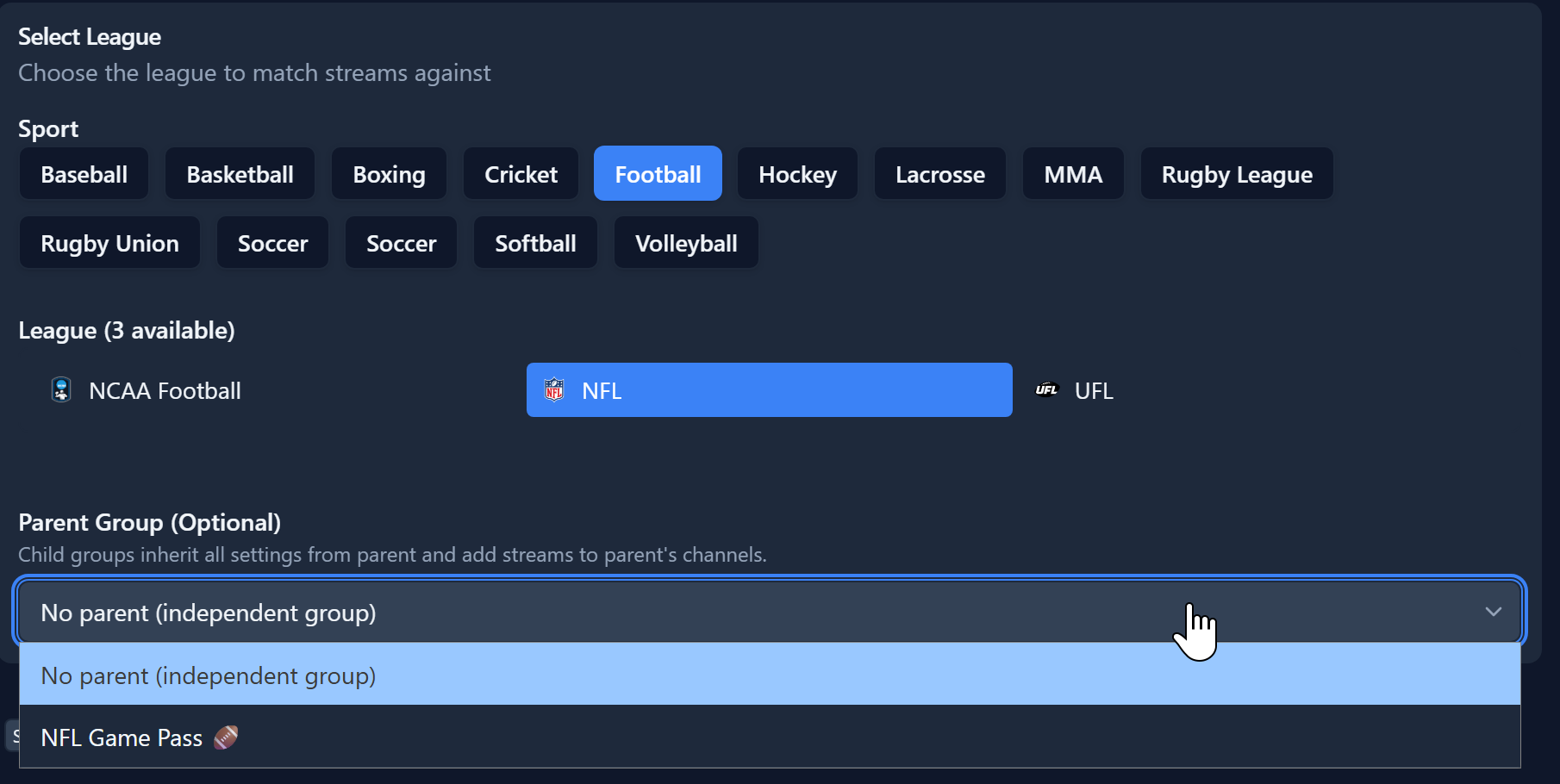Select the sport type then League you wish to use for the group.