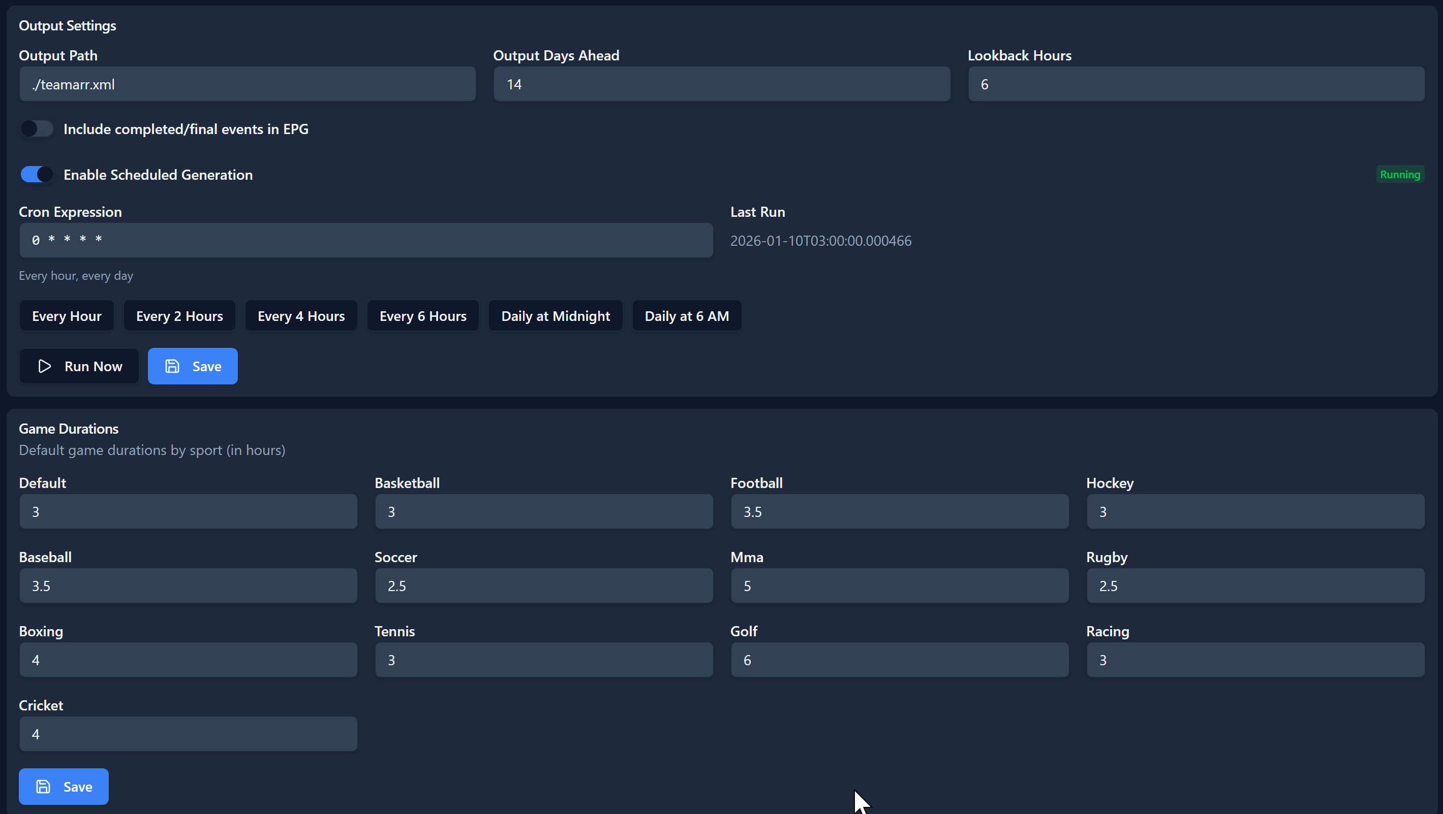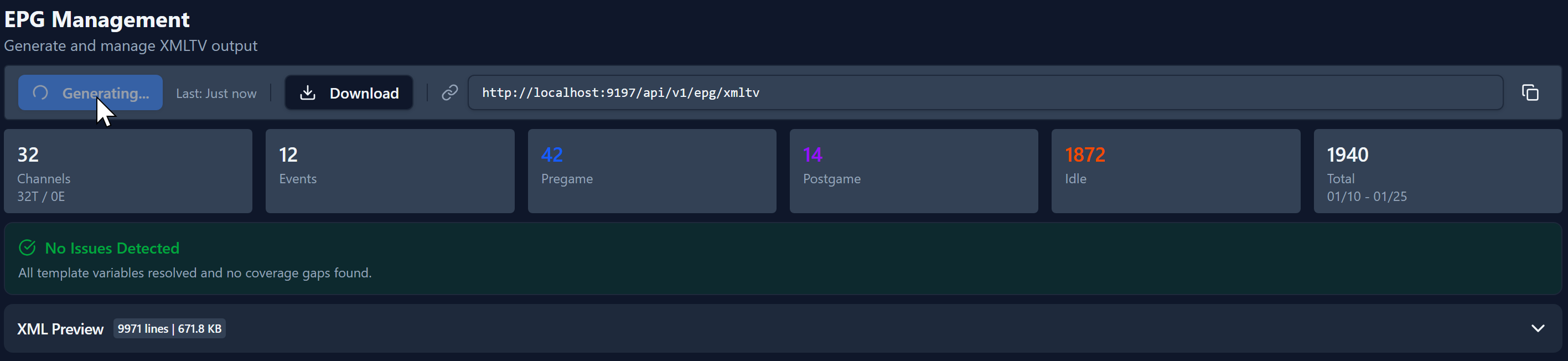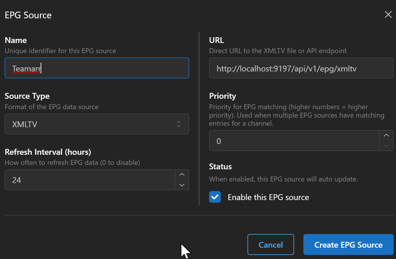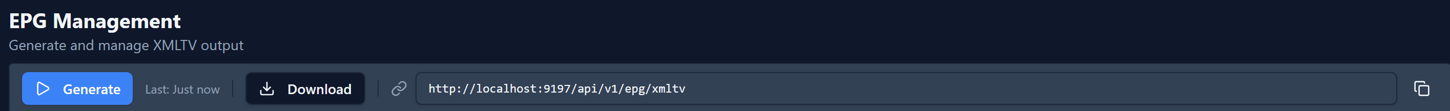 Now that everything is configured you're ready to generate your EPG. You do need to copy the EPG URL and add it to Dispatcharr as an EPG source. At the top you can copy the EPG link the default would be https://localhost:9195/api/v1/epg/xmtv but it may be different depending on your configuration to use ip or a different port.