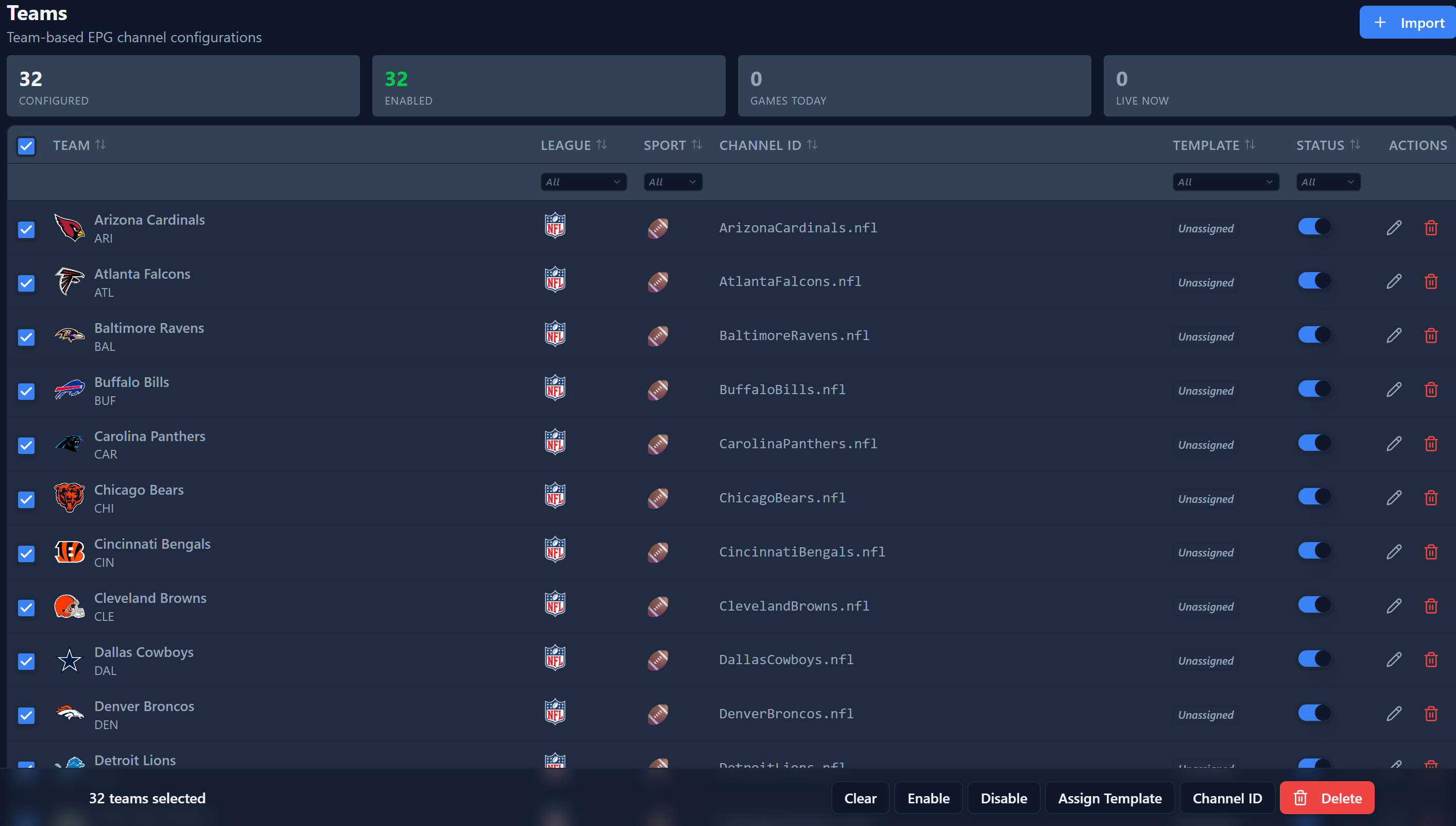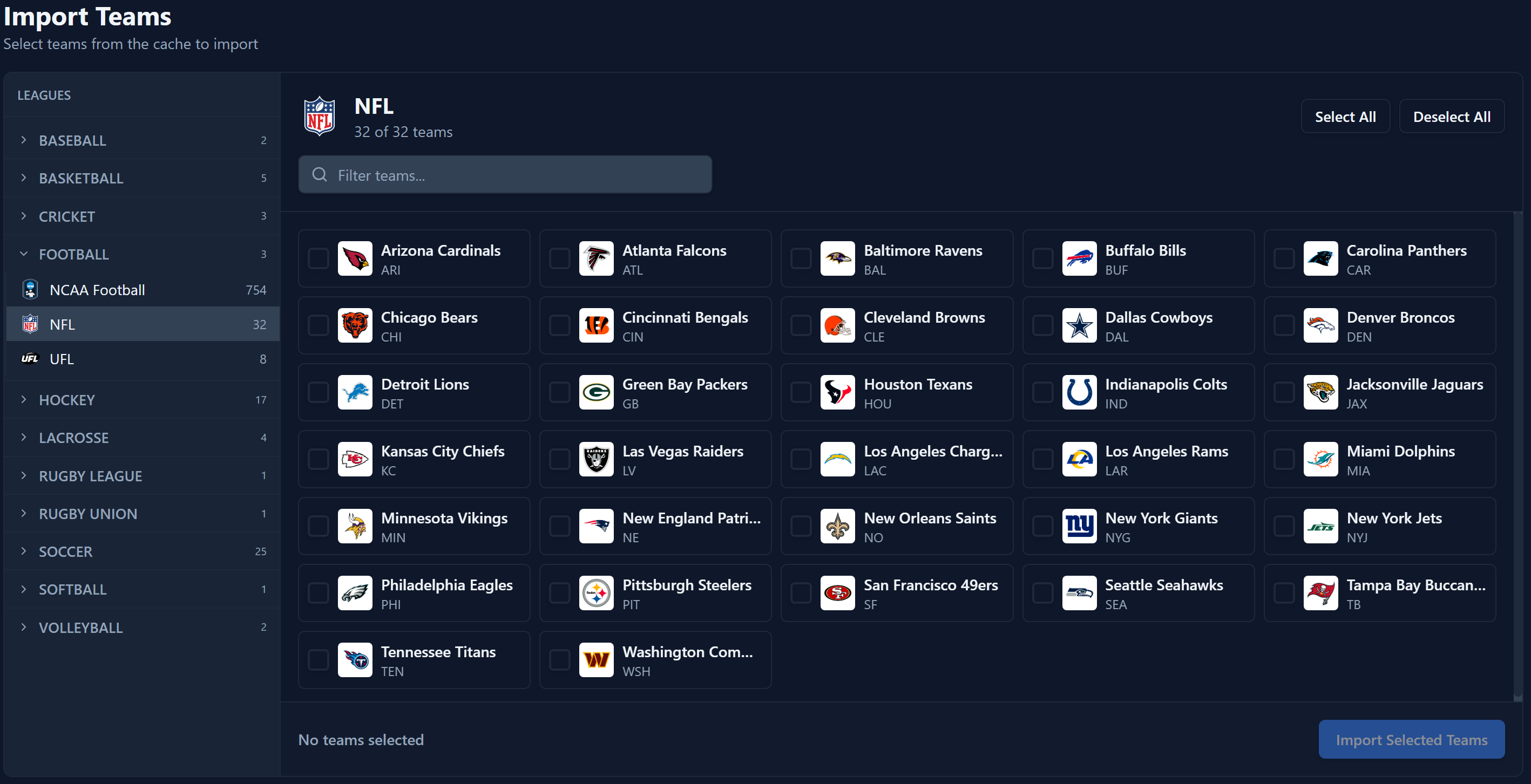 sport/league combination. When done click Import Selected Teams.