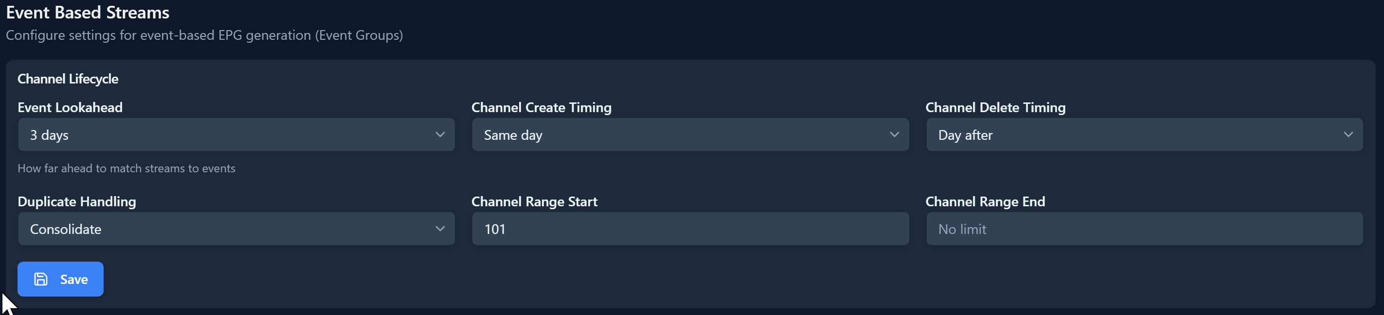 Dispatcharr. Same day is 11:59pm (local time) the day of the event except