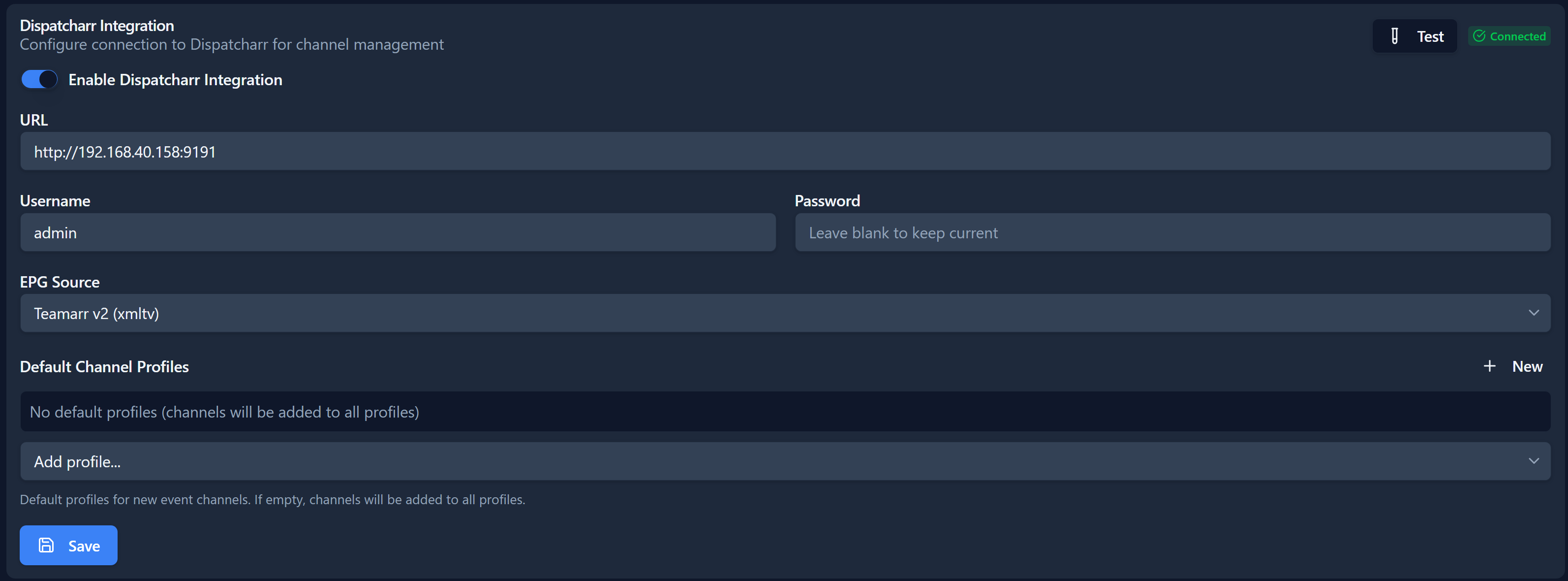 Dispatcharr URL, Username and Password then Test at the top right to ensure