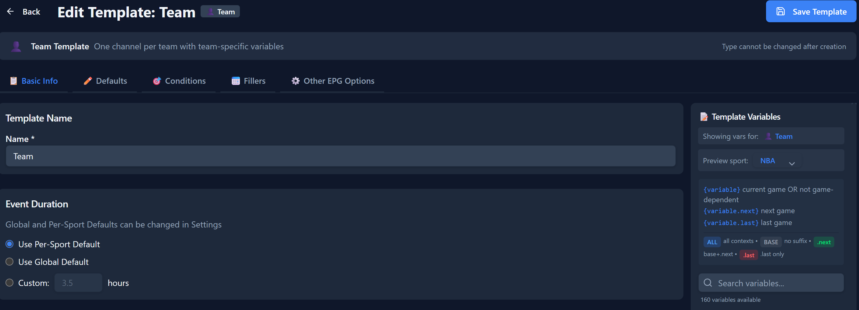 events using this template or specify the per-sport or global default from