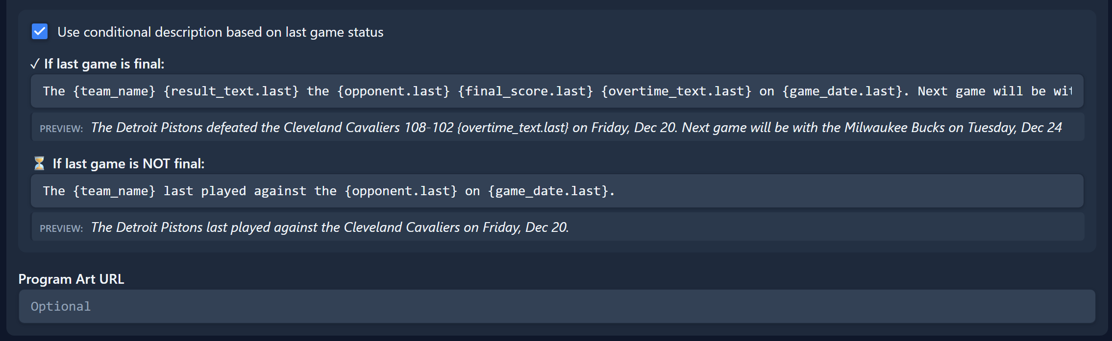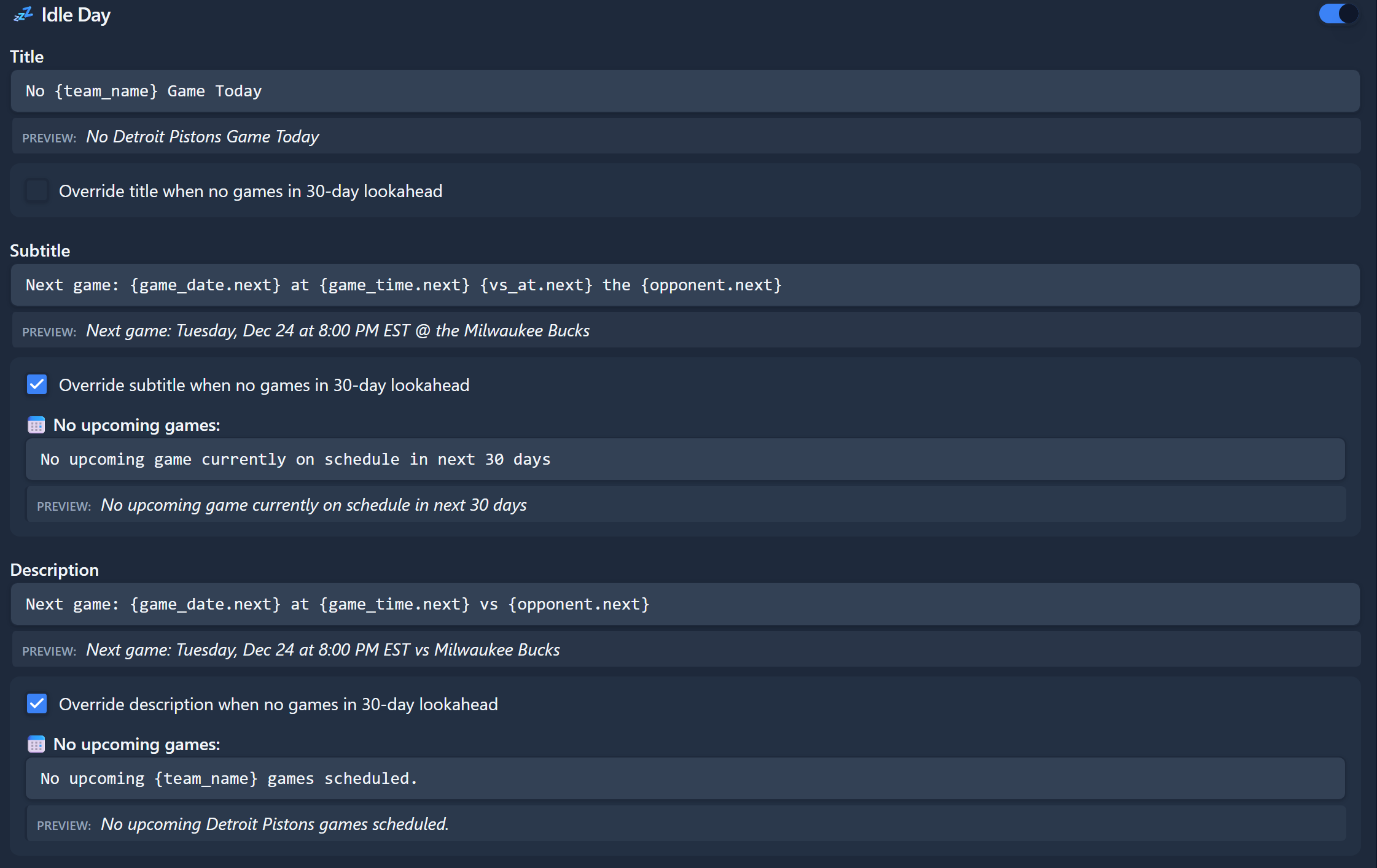 For Team templates use the suffix ".next" to reference the upcoming game/event.